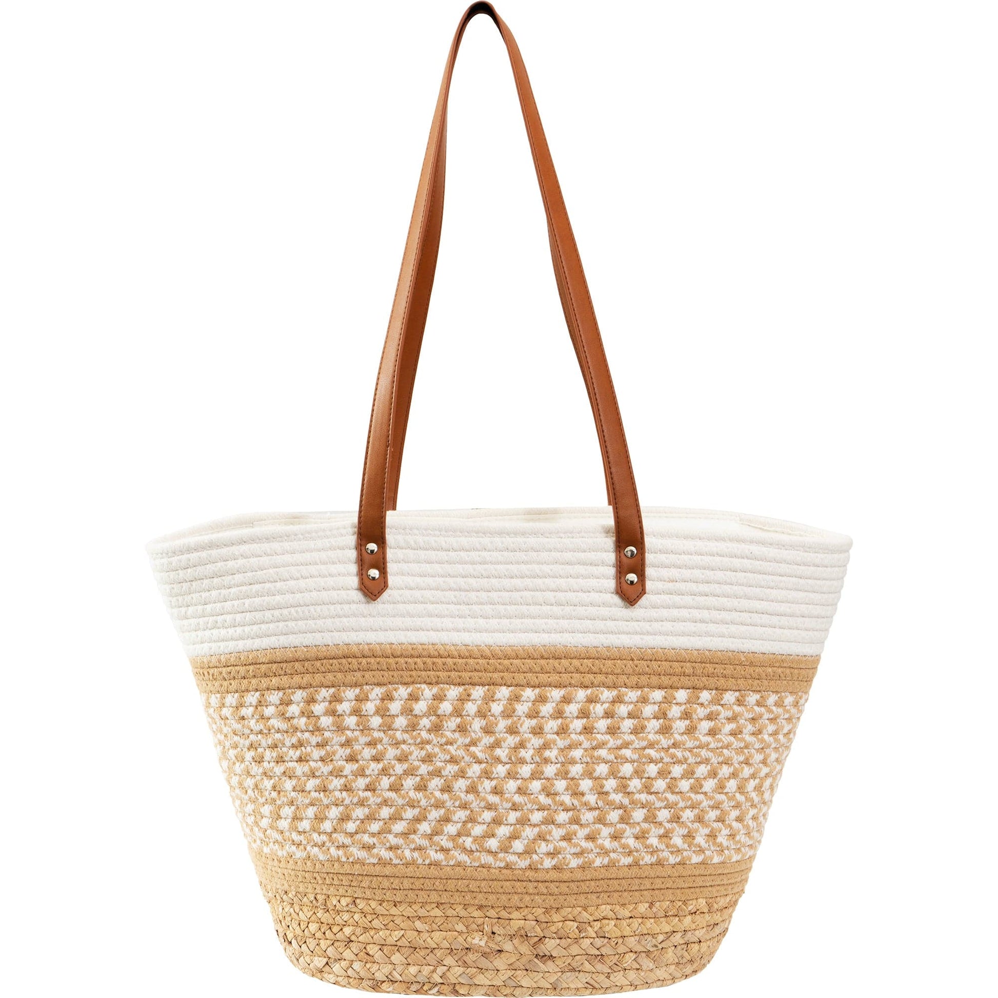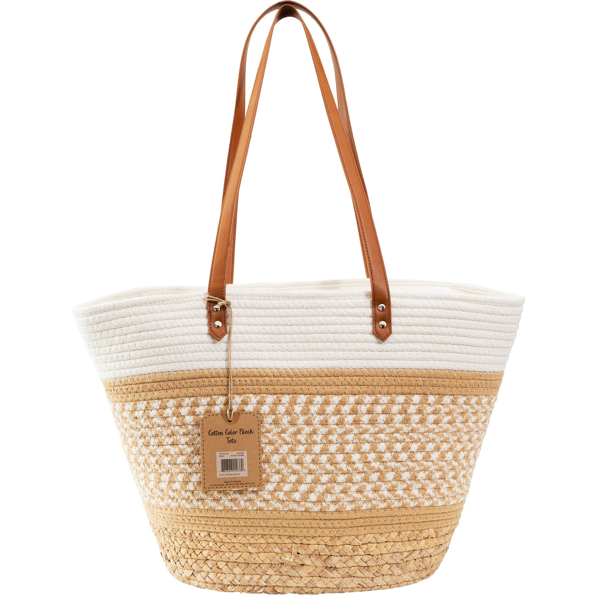 Embrace effortless style with the Magid 100% Cotton Woven Shoulder Tote, featuring natural cotton woven in a chic pattern, complemented by sleek faux leather PU shoulder straps. Perfect for casual outings, beach days, or as your everyday go-to bag, this tote offers both function and fashion in one versatile piece.
